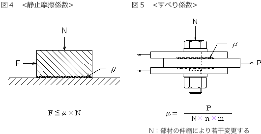 これは、物体の摩擦面に働く摩擦力と垂直抗力の比で表される静止摩擦係数と意味合い的には同じですが、摩擦接合では摩擦係数を算定する場合、材間圧縮力としてのボルト張力(軸力)はすべり発生時のボルト張力(軸力)ではなく、ボルトに与える初期ボルト張力(軸力)を用いて算定するため、厳密な摩擦係数ではなく、見かけ上の摩擦係数であり、これをすべり係数と呼んで静止摩擦係数と区別しています。